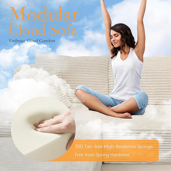 - No Assembly Required and Easy Care: Your modular cloud sofa arrives in two boxes, please be patient and wait for all your parcels to be delivered. After receive that, simply unbox, gently pat the cushions to revive their springy loft, and let it expand to its full, photogenic shape within 72 hours. The faux fur cover resists everyday spills and stains, all you need is a mini vacuum or a damp rag to make your cleaning easy