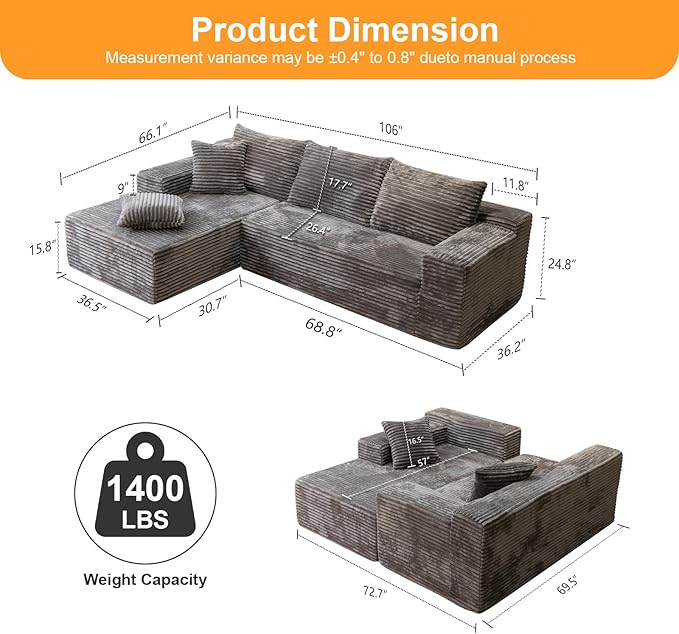 - No Assembly Required and Easy Care: Your modular cloud sofa arrives in two boxes, please be patient and wait for all your parcels to be delivered. After receive that, simply unbox, gently pat the cushions to revive their springy loft, and let it expand to its full, photogenic shape within 72 hours. The faux fur cover resists everyday spills and stains, all you need is a mini vacuum or a damp rag to make your cleaning easy