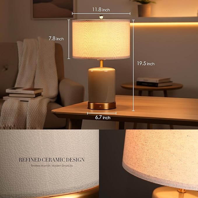 - Timeless Ceramic Design – The Dune features a glossy ceramic base with a subtle crackled glaze, brushed brass accents, and an oatmeal fabric drum shade that diffuses soft, natural light. Available in Cream White, Sage Green, and Stone Grey, it complements modern, minimalist, and classic décor.