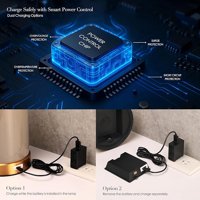- Safe, Compatible Lighting System – Comes with a 5W low-voltage (5V) LED bulb designed specifically for O’Bright battery-powered lamps. For safety and performance, use only 5V LED bulbs — standard 120V bulbs are not compatible. A built-in smart power control chip also protects against overcharging, overheating, and overload.