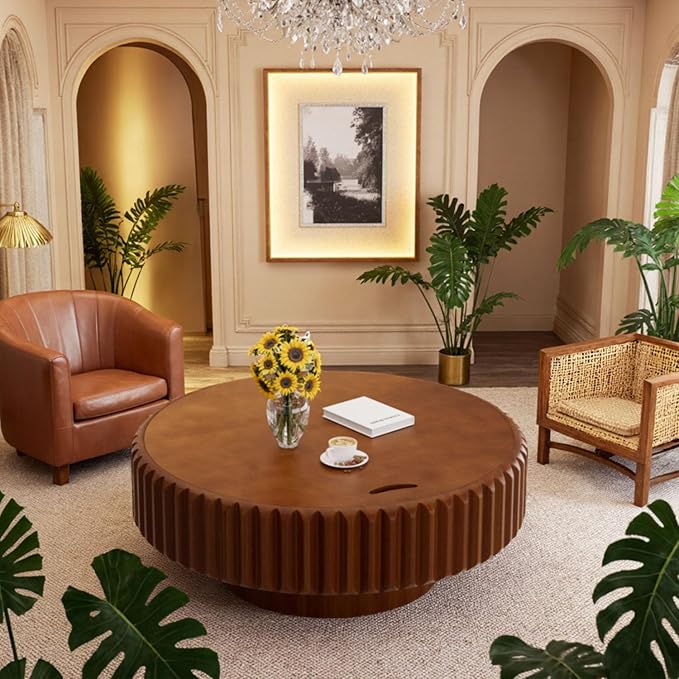 - Round Coffee table with Storage : This Round Coffee Table with Storage features a stylish design and a perfect combination of storage space under the lid, the unique mushroom shape with fluted design will effortlessly blend with your existing decor, whether you prefer a contemporary or minimalist style.