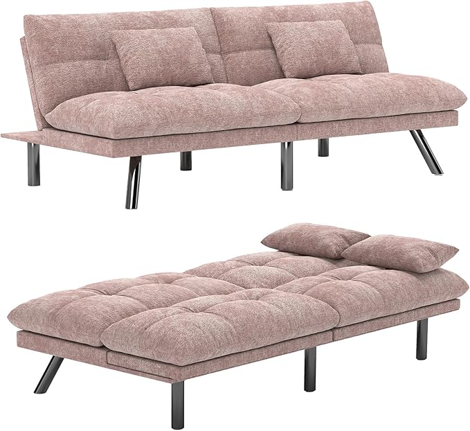 Futon Sofa Bed Convertible 70 inch Solid Wood Couch for Living Room, Chenille Fabric, 2 Cushions (Pink)