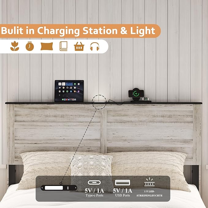 - Wooden Bed Frame with Charging Station and Led Light: The wood bed frame with charging station includes 1 USB Port and 1 Type C Port, great for keeping your phone/ laptop charged while entertaining in bed without getting up from your bed.