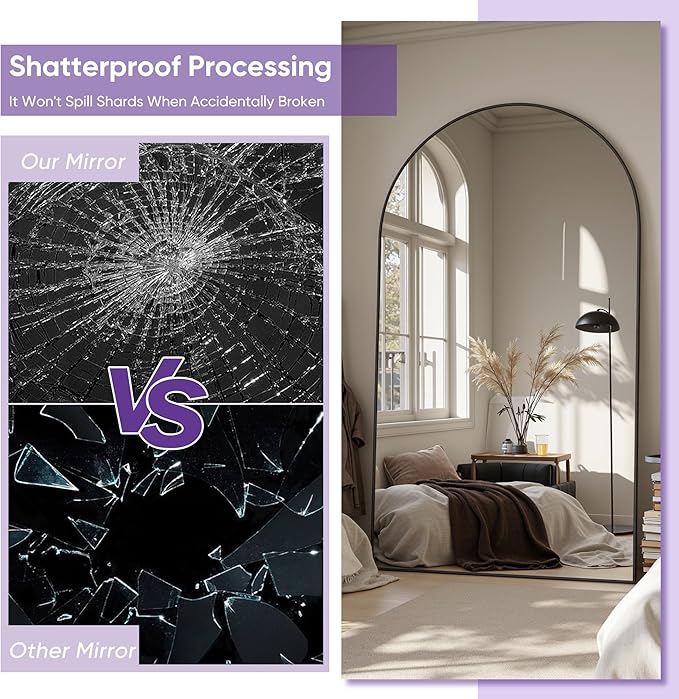 - 【Full Length Mirror】With its generous 86" height and 46" width, this mirror offers a full, clear reflection so you can confidently view your entire outfit. The arched design and minimalist frame blend effortlessly into any decor. Perfect for bedrooms, living rooms, entryways, home gyms, cloakrooms, clothing stores, and more—wherever you need a practical and stylish mirror.