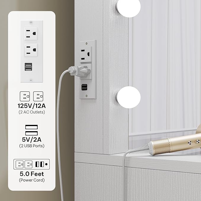 - Built-in Charging Station & Easy Cleaning – Stay connected with the integrated vanity with charging station containing 2 USB ports and 2 AC outlets. The elevated design allows effortless cleaning underneath, making this vanity for small spaces both practical and maintenance-friendly