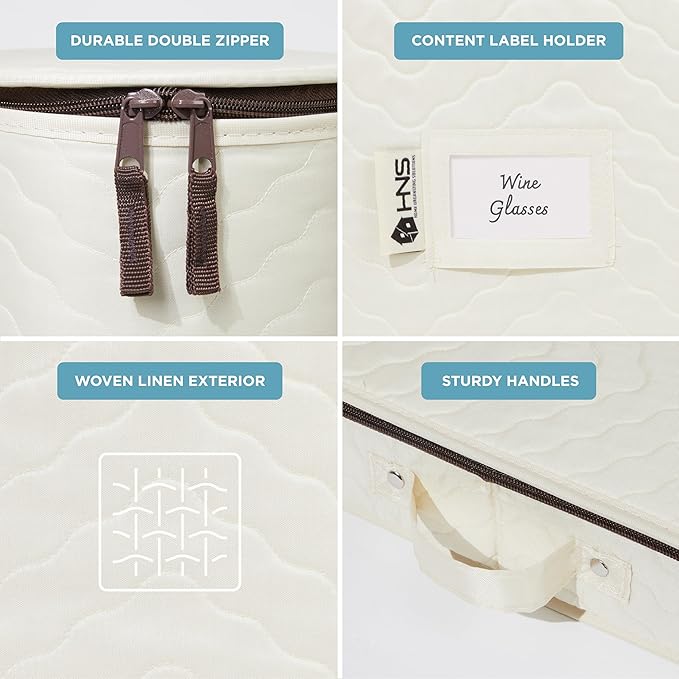 Hard Shell China Storage Containers 12-Piece Set Moving Boxes for Dinnerware, Glasses, Plates, Mugs and Saucers Sturdy Dish Organizer with Dividers for Seasonal Storage - Service for 12 -Beige Quilted
