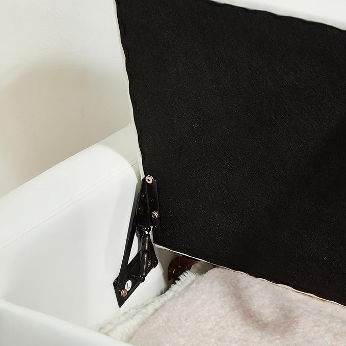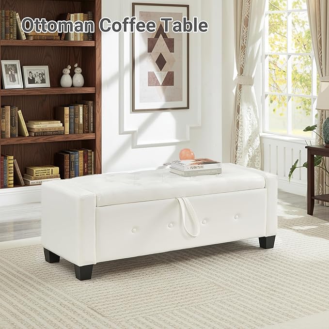 48" Faux Leather Ottoman with Storage, Tufted Storage Ottoman Bench with Safety Hinge, Rectangular Extra Long Bench for Bedroom, Living Room, Entryway and Window, White