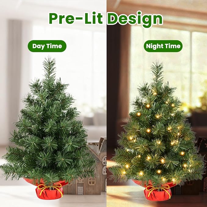 - Long-Lasting & Durability:The small Christmas tree is pre lit 50 battery-powered warm white LED lights and a built-in 6-hour on/18-hour off timer.The Christmas tree is features a red burlap base,the branches are crafted from durable,weather-resistant materials to bring lasting joy for many Christmases to come.