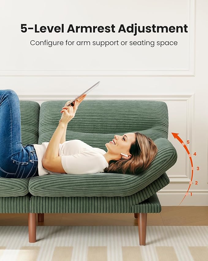 - ADJUSTABLE BACKREST & ARMRESTS:The backrest of this convertible futon sofa bed couch adjusts to three angles at 105°, 160°, and 180°. The small futon couch also features armrests that offer five different angles, allowing you to personalize for lounging or sleeping