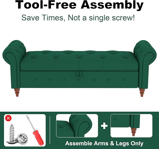 - Easy & Tool-Free Assembly:Spend less time assembling and more time enjoying your new bed bench. No screws or tools are needed — simply attach the arms and legs using our plug-in style hardware. The quick, hassle-free setup makes this bedroom bench with storage a convenient and functional addition to your home, even for first-time furniture buyers.