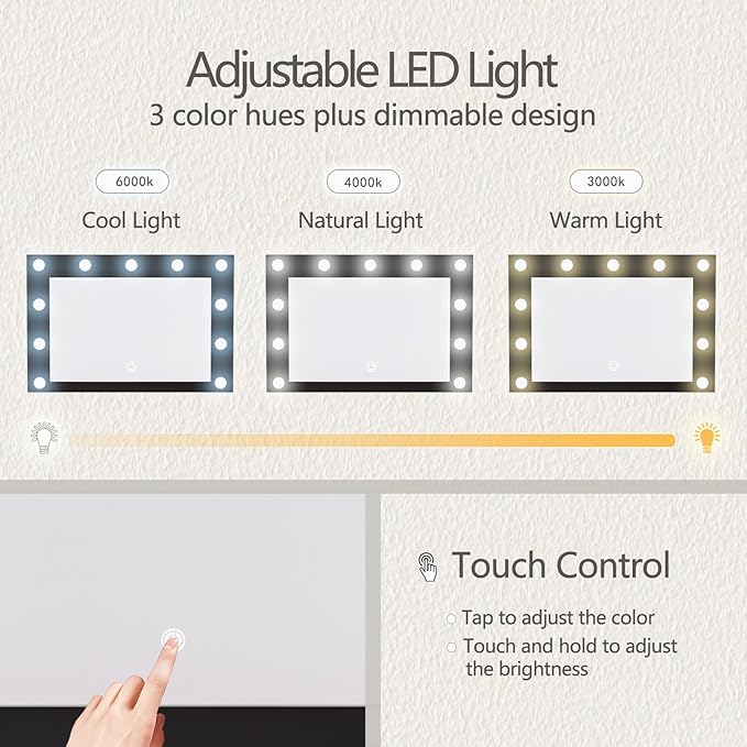 - Adjustable Lighting: The vanity has a large mirror with 10 lights surrounding it. Longpressing the controller allows you to choose between 3 color modes and alter the brightness