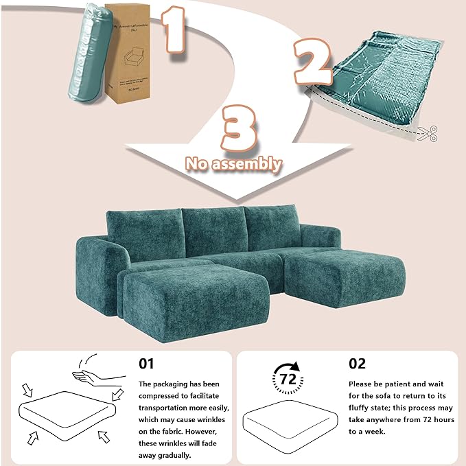 - Boneless Sofa with One-Piece Construction:The EASE MOOSE cloud sofa expands naturally to full shape within 72–96 hours after unpacking. Made with high-density foam compressed for easy shipping, it’s ready to use once unboxed—just unfold and enjoy! To speed up expansion, gently pat the cushions and use low-heat steam on the chenille fabric to smooth wrinkles
