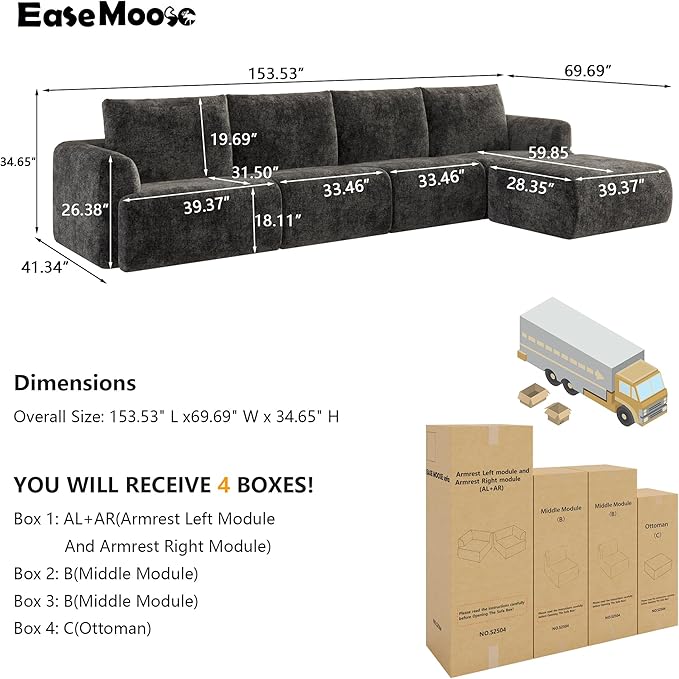 - Customer Service: This L-shaped couch will be delivered in 4 boxes, please check all parts before assembly. If you encounter problems during the installation process, please contact us and we will provide installation videos or online guidance. [Notice]: We kindly suggest releasing ONLY the Ottoman (C) to confirm that our product satisfies you before opening all the packages.