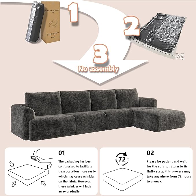 - Boneless Sofa with One-Piece Construction:The EASE MOOSE cloud sofa expands naturally to full shape within 72–96 hours after unpacking. Made with high-density foam compressed for easy shipping, it’s ready to use once unboxed—just unfold and enjoy! To speed up expansion, gently pat the cushions and use low-heat steam on the chenille fabric to smooth wrinkles