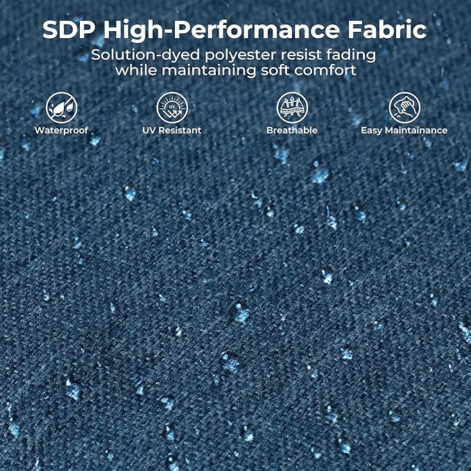 - PERFORMANCE: Our high-performance blue polyester fabric for cushion is rated at 1200 UV hours - 3X higher than typical polyester- to provide years of fade resistance and water resistance, more durability, easier to clean, and skin-friendly soft. 3.5-inch cushions provide an upgraded comfort and back support.