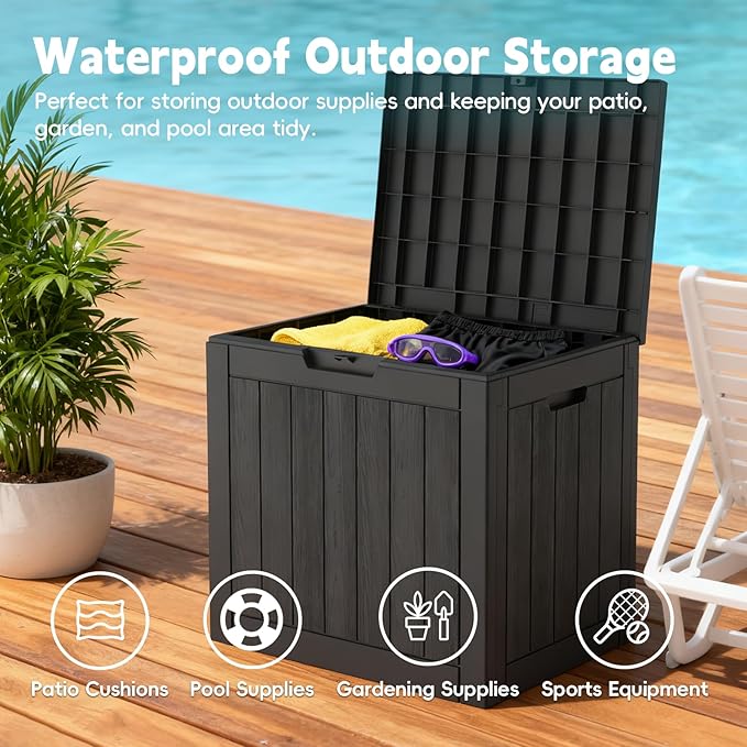 - Durable & Resin Wood-grain: All-weather outdoor environment--A service life of many years. High-density UV-resistant resin and wood-grain finish, this deck box has excellent ultraviolet protection and waterproof ability