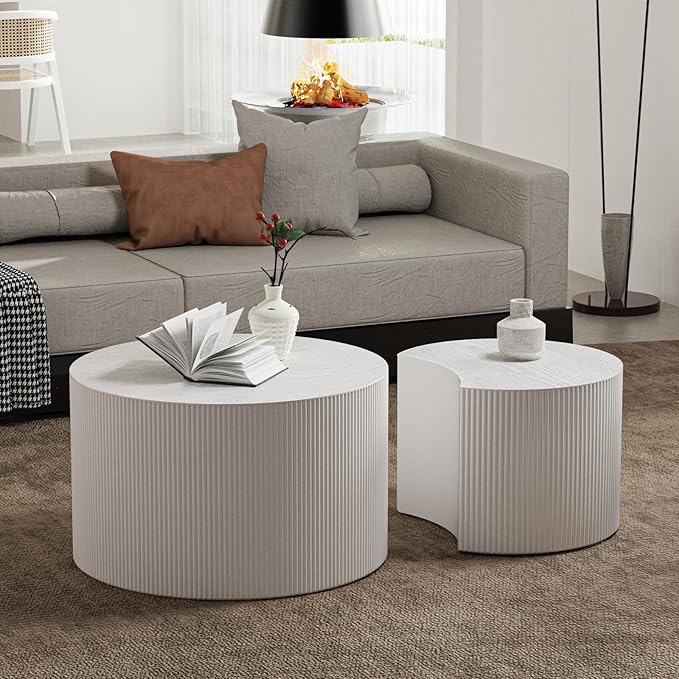 Round Nesting Coffee Table Set of 2, Round Fluted Coffee Tables for Living Room Modern Nesting End Side Tables for Small Spaces (C White)