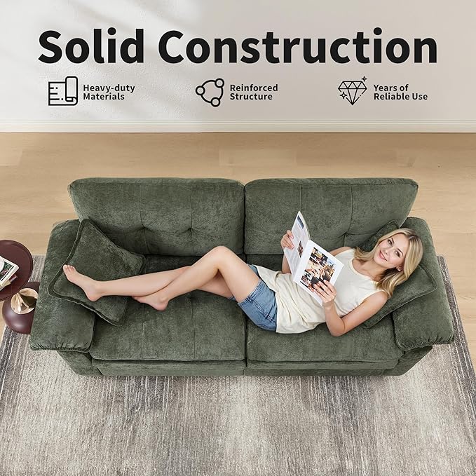 - 【PREMIUM CHENILLE FABRIC & DURABLE DESIGN】Wrapped in luxurious chenille fabric, this sofa offers softness + stain resistance for everyday use. The solid frame and 800lbs weight capacity ensure long-lasting stability, Extra-Wide Padded Armrests ,Contoured to perfectly support your arms for ultimate relaxation whether lounging sideways for movie nights or leaning back for quick naps.