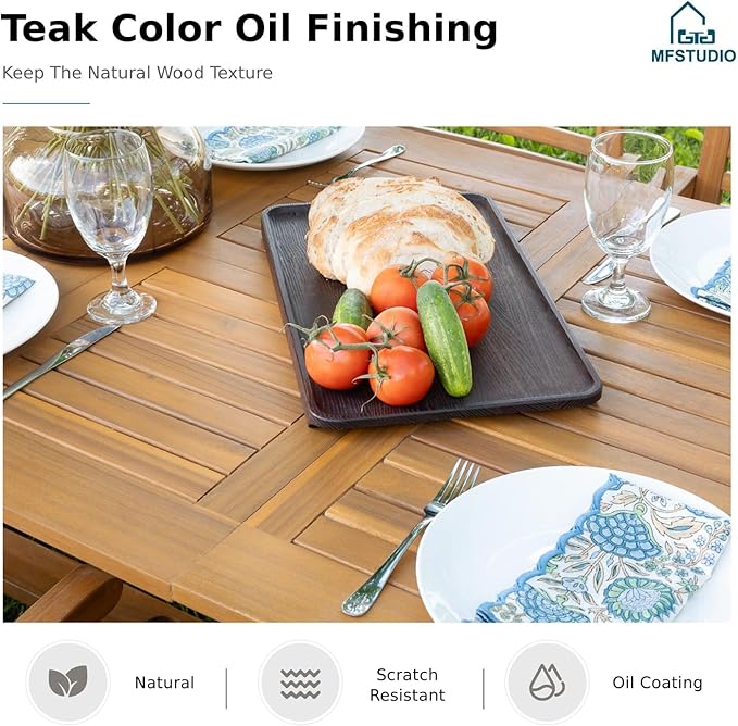 - Extendable Dining Table & Premium Teak Wood Material: Hidden expandable design rectangular patio dining table make it convenient to adjust the table length that meets multiple demands for 6-8 persons. Crafted from great quality acacia wood material, this versatile outdoor dining set not only stylish but also durable and weather-resistant, ensuring that it will last for years to come