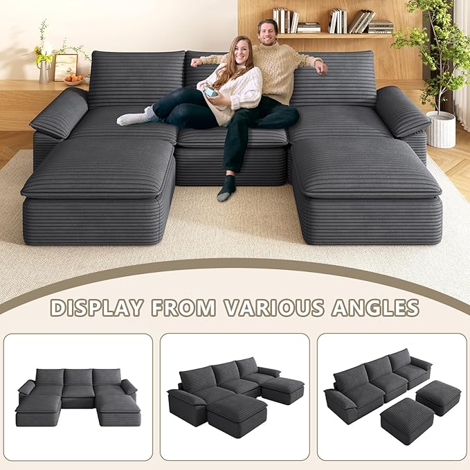111" Cloud Sectional Couch with U-Shaped Chaise, Corduroy Sectional Sofa with Ottoman, Boneless Couch with Deep Seat in a Box for Living Room, No Assembly Required (Dark Grey)