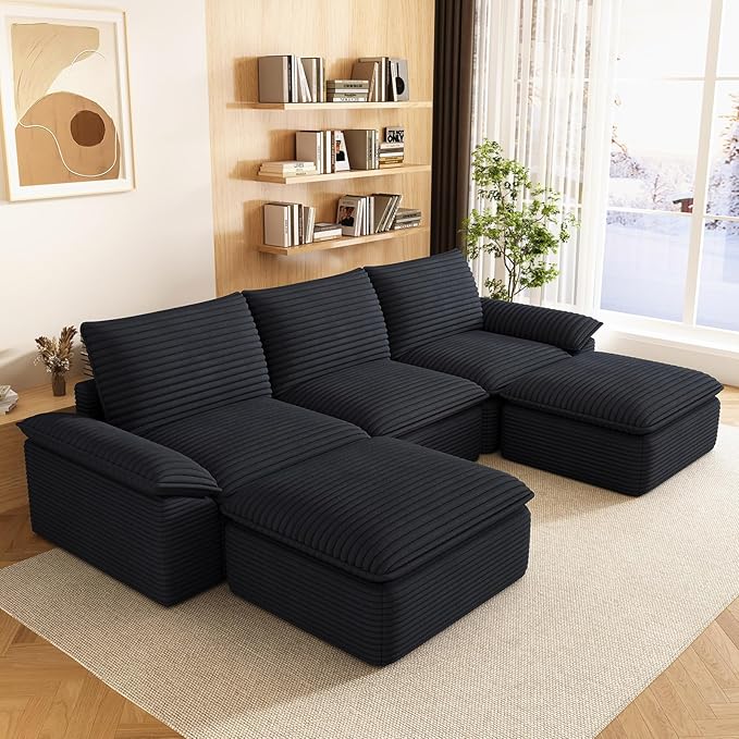111" Cloud Sectional Couch with U-Shaped Chaise, Corduroy Sectional Sofa with Ottoman, Boneless Couch with Deep Seat in a Box for Living Room, No Assembly Required (Black)