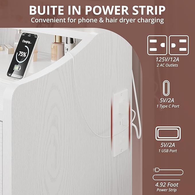 - Built-in Charging Station: This small vanity is equipped with power outlets with a USB port, a Type C port, and 2 AC ports, convenient for charging hair dryers, mobile phones, and other devices