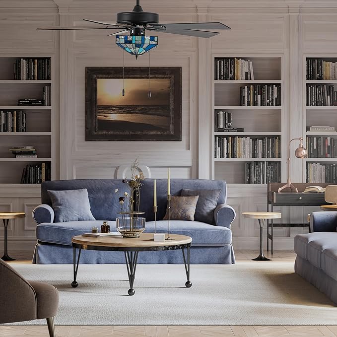 - Mission style ceiling fan features 140 hand-cut stained glass pieces for beautiful artisan style