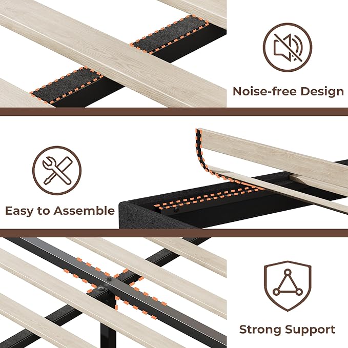 - 【Upholstered Bed with Noise-free Design】Relax in comfort with the thoughtfully designed platform bed frame king size with upholstered backrest. Its soft padding and premium fabric provide exceptional lumbar support for reading, watching TV, or unwinding in bed, while enhancing overall sleep comfort for a restful night.The innovative design incorporates soft plastic spacers between connecting rods and frame, effectively eliminating metal-on-metal contact to maintain whisper-quiet operation during movement, without squeaks or noise, an ideal solution for light sleepers seeking both comfort and sturdiness.