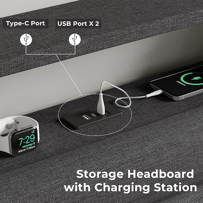 - 【Upholstered Bed Frame King with Fast Charging Station】Stay powered up effortlessly with the king bed frame with headboard, includes 2 USB ports and a type-C port, this led bed frame let you charge phones, tablets and more simultaneously. No more tangled cords—keep all devices juiced up right where you need them.
