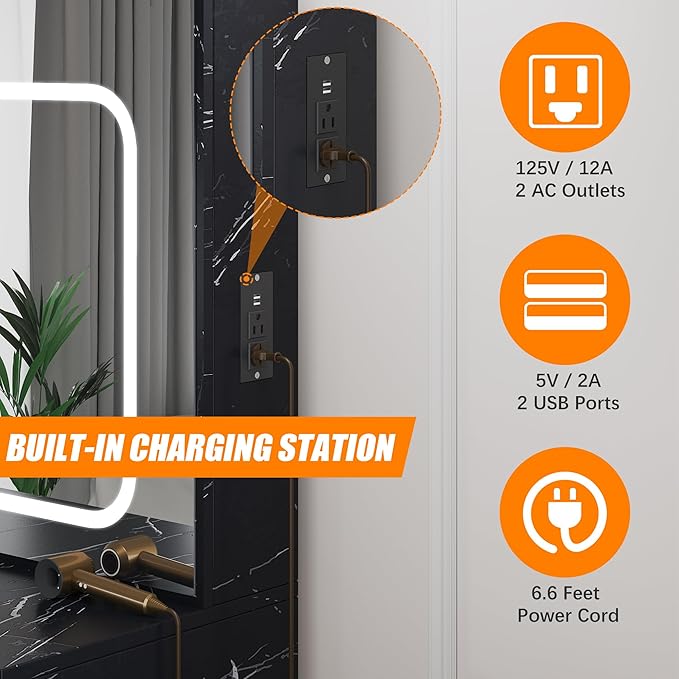 - Thoughtful Design Elements: Our vanity mirror with lights integrates functionality with finesse, including a built-in charging station equipped with 2 AC outlets and 2 USB ports for your convenience. Its modern minimalist aesthetic infuses any space with sophistication and charm.