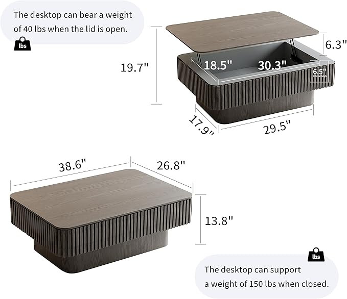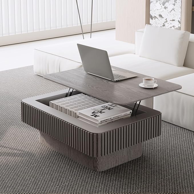 - MODERN LIFT-TOP & FLUTED DESIGN: The Homora lift-top coffee table combines contemporary fluted detailing with a warm wood grain finish, adding minimalist elegance to any living room or apartment. The 38.6"L × 26.8"W surface provides ample space while maintaining a space-saving footprint