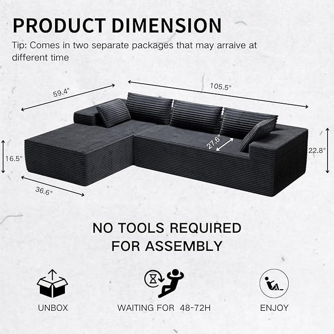 - No Assembly Required - Enjoy instant comfort with absolutely no assembly required—just unbox and relax. The modular cloud sofa expands to its full plush shape within 72 hours. Note: For convenient shipping, your order may arrive in 2pcs separately shipped packages