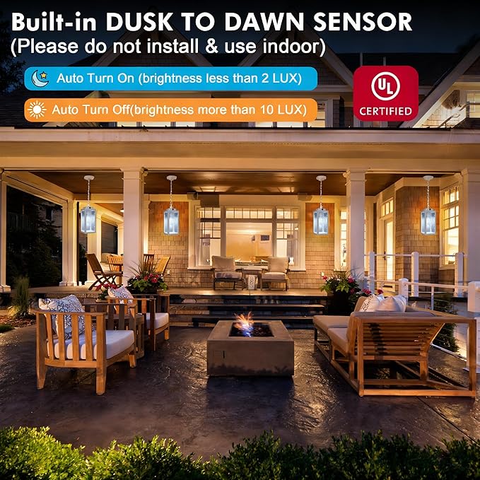 - Free your hands, you'll never have to worry about turning this outdoor pendant light on and off. Why? With the dusk-to-dawn sensor, this outdoor chandelier for porch will automatically turn on at night when the environment is dark (below 2 LUX) and turn off during the day (above 10 LUX). Also, it saves on electricity costs. Outdoor ceiling lights for porch can only be used outdoors. (since the sensor can't work for indoor use)