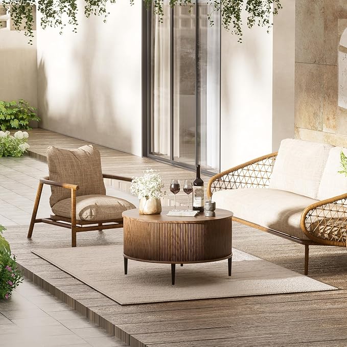 Yechen 31.5" Round Coffee Table with Storage,Fluted Lift Top Center Table, Midcentury Modern Flip-top Curved Table for Living Room,Walnut