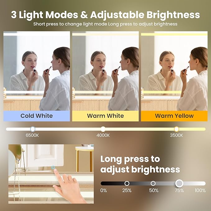 - LED Mirror and Customizable Lights: The LED mirror will prioritize your makeup experience, which can reflect your appearance more clearly from every angle.The adjustable LED mirror provides three lighting modes—Cool (6500K), Warm (3500K), and Natural (4500K)—with touch controls to switch modes and adjust brightness. Ideal for different scenes as home, salons, and studio makeup applications