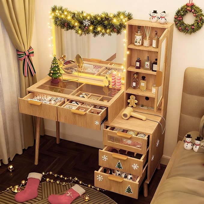 - Vanity Table with Charging Station: Built-in power outlets support hairdryers, straighteners, or chargers. This vanity table allow you to conveniently connect and charge hair tools, smartphones, tablets, and other devices, making this vanity practical for daily use. Also, this vanity organizer is a great gift for birthdays, Valentine's Day, Mother's Day, and Christmas
