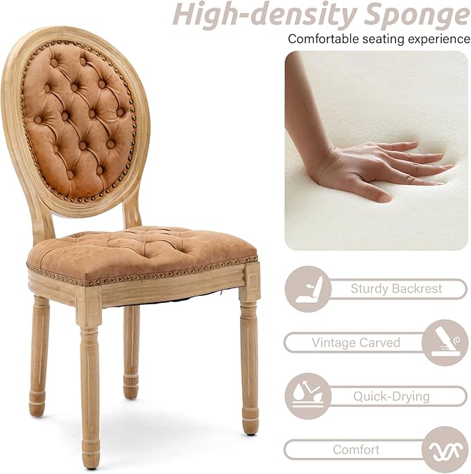 - 【Superior Material】The french dining chair is upholstered for comfort and elegance. The frame and legs of the chair are made of rubber wood, which provides enough safety to hold up to 280 lbs. The seat cushion has high-rebound foam to provide you with a comfortable seating experience. There are small anti-scratch feet on the bottom of each leg to prevent damage to the floor.