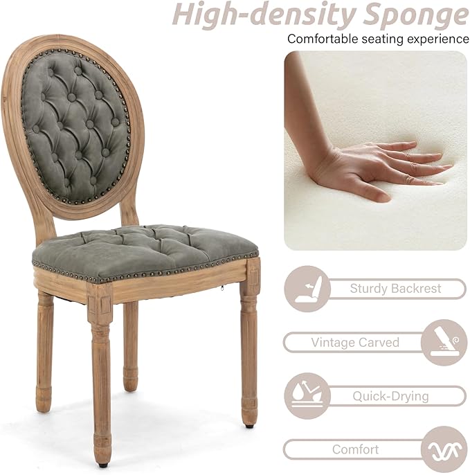 - 【Superior Material】The french dining chair is upholstered for comfort and elegance. The frame and legs of the chair are made of rubber wood, which provides enough safety to hold up to 280 lbs. The seat cushion has high-rebound foam to provide you with a comfortable seating experience. There are small anti-scratch feet on the bottom of each leg to prevent damage to the floor.