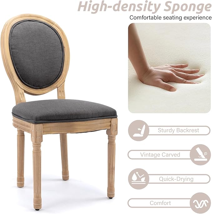 - 【Superior Material】The french dining chair is upholstered for comfort and elegance. The frame and legs of the chair are made of rubber wood, which provides enough safety to hold up to 280 lbs. The seat cushion has high-rebound foam to provide you with a comfortable seating experience. There are small anti-scratch feet on the bottom of each leg to prevent damage to the floor.