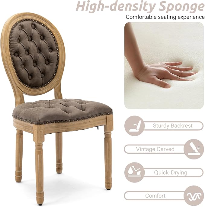 - 【Superior Material】The french dining chair is upholstered for comfort and elegance. The frame and legs of the chair are made of rubber wood, which provides enough safety to hold up to 280 lbs. The seat cushion has high-rebound foam to provide you with a comfortable seating experience. There are small anti-scratch feet on the bottom of each leg to prevent damage to the floor.