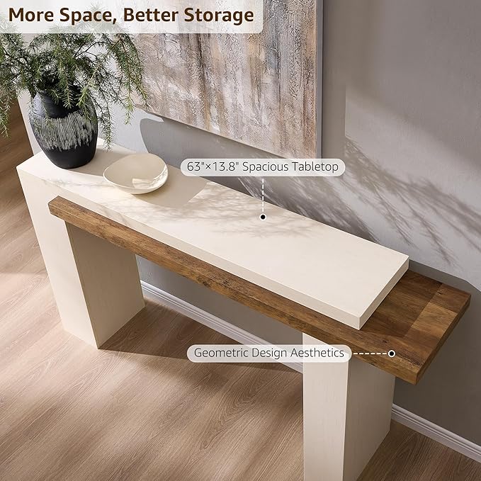 - Ample Storage with Dual Layers: This console table is a perfect blend of aesthetics and practicality. With its spacious dimensions of 63” W X 13.75” D X 33.5” H, it fits a variety of spatial needs. The double-tiered tabletop design increases storage and display space. The upper surface can perfectly showcase decor, greenery, or even a TV, while the lower tier is ideal for stowing daily small items, enhancing space utilization.