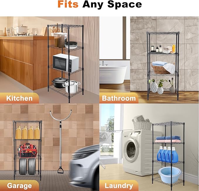 - Multi-Purpose Use: 4-Tier wire shelving (18" L x 12" W x 38.2" H) fits compact spaces yet holds bulkier items effortlessly. Ultra-narrow spacing secures small tools, plants, or pantry jars without slipping, transforming cluttered corners into organized zones, Ideal for various spaces such as kitchens, bathrooms, garages, and laundry rooms