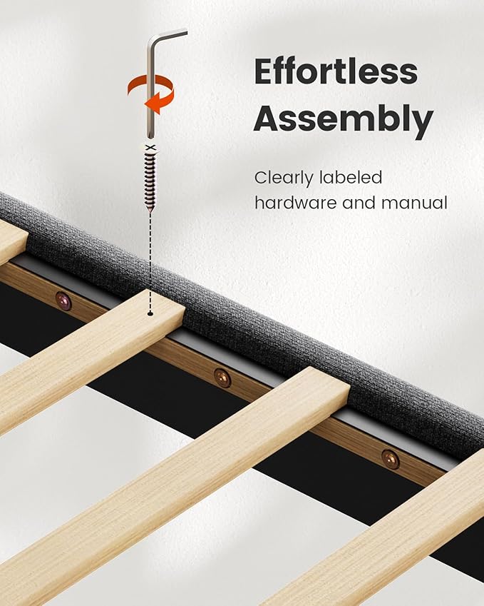 - 【Easy Installation】: Assembly is simple thanks to clearly labeled parts, included tools, and detailed instructions. The slats connect via Velcro for secure alignment. Whether you're upgrading your guest room or main suite, this Queen Bed Frame with storage included setup ensures a hassle-free experience with all the elegance of premium upholstered bed frame.