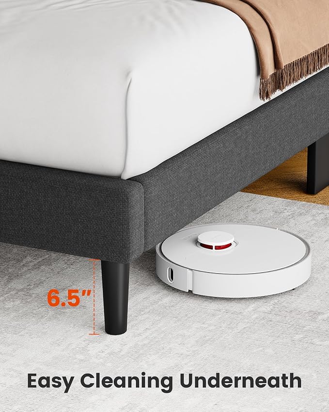 - 【Multi-Function Storage Space】:This bed frame is designed with practicality in mind. The grey bed frame features a 10″ clearance. under-bed storage space is perfect for collecting luggage, shoe cases, and storage boxes. Thanks to its thoughtful design, the sweeping robot can easily pass through, ensuring a clean and tidy bedroom.