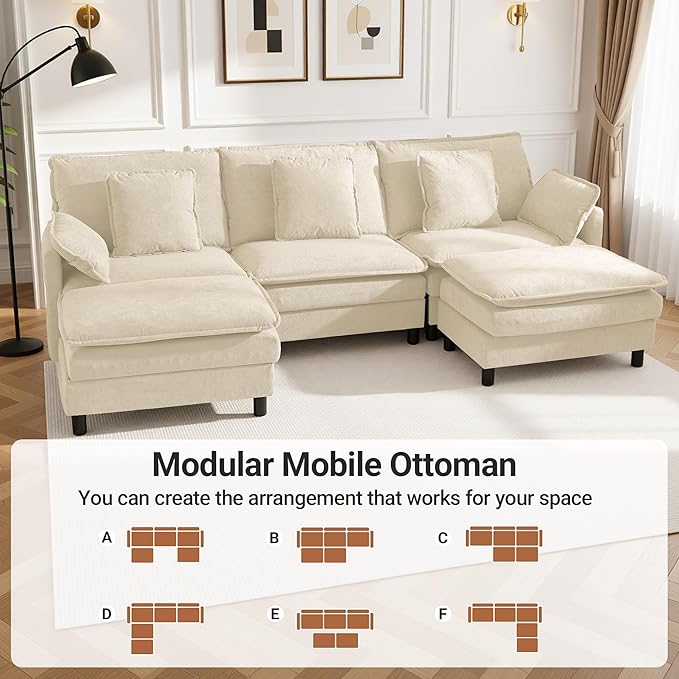 Claiks 110" Modular Sectional Sofa, Cloud Couch with Ottoman, U-Shaped 5-Seater Sofa in Chenille Fabric, Deep Seat Comfy Couch with Pillows for Living Room & Offices, Beige