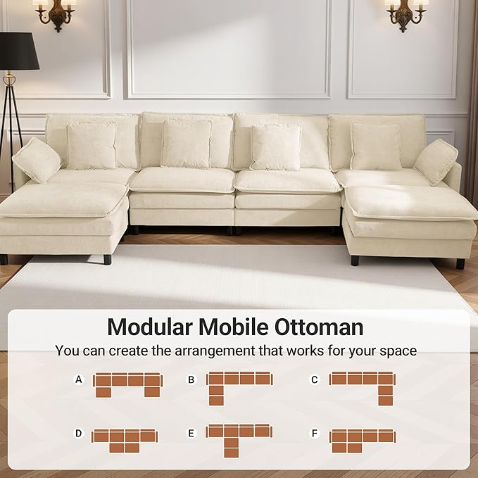 Claiks 148" Modular Sectional Sofa, Cloud Couch with Ottoman, U-Shaped 6-Seater Sofa in Chenille Fabric, Deep Seat Comfy Couch with Pillows for Living Room & Offices, Beige