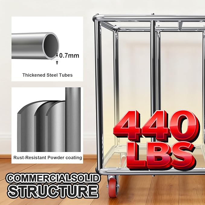 - 【Extra Large Capacity】 - This 400L (88 Gal) commercial laundry cart measures 35.4"L x 25.6"W x 31.5"H and holds up to 330 lbs. This heavy duty rolling laundry cart is built to manage large, bulky loads from hotels, gyms, or large families, keeping lights and darks perfectly separated in its dual laundry baskets with wheels.