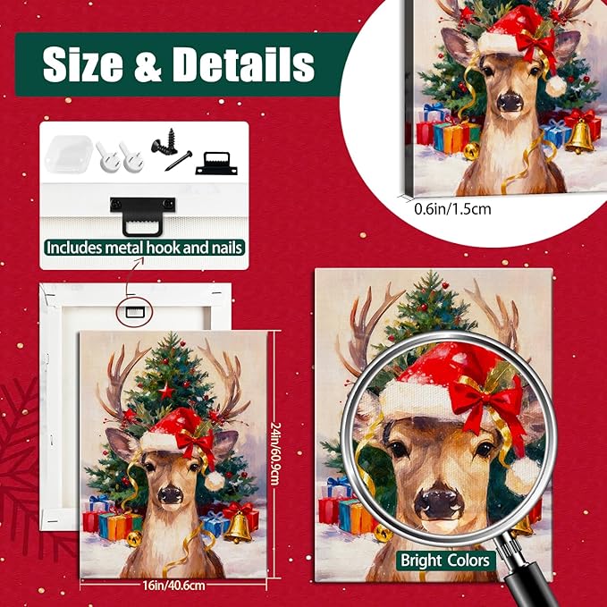 • 【Easy to Hang】: Equipped with a pre-attached hanger, this Christmas canvas art sets up in seconds. Simply hang it and instantly immerse in a joyful festive atmosphere.