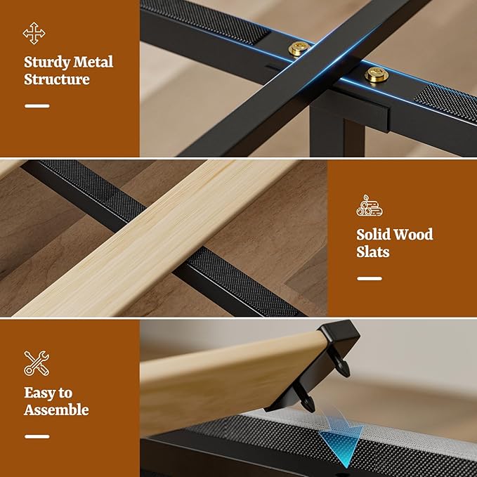 - Heavy Duty Construction : Engineered for durability, the frame uses solid wood slats and a steel reinforced base to support up to 1000 lbs. No box spring required—compatible with memory foam, latex, or hybrid mattresses. Silent, non-slip slats eliminate creaks, ensuring a peaceful night’s sleep
