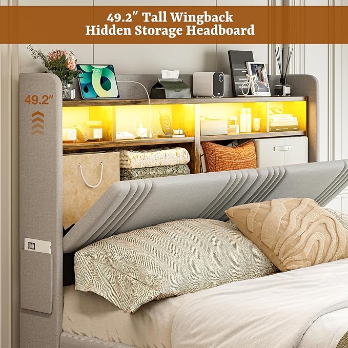 - Tall Hidden Storage Headboard : 49.2" extra tall upholstered wingback headboard provides better back support and comfort. Maximize space with the dual-functional headboard featuring a hidden secret compartment 2-tier open shelf. There are storage pockets on both sides for small items such as remote controls